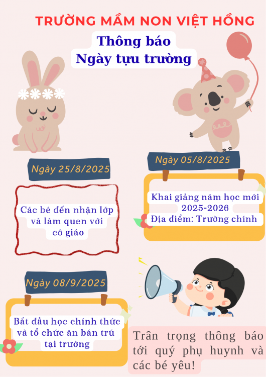 🌻🌻Trường Mầm non Việt Hồng, thôn Việt Thành, xã Hùng An, tỉnh Tuyên Quang xin trân trọng thông báo đến các bậc phụ huynh lịch tựu trường, khai giảng và học chính thức năm học 2025-2026 cụ thể như sau: