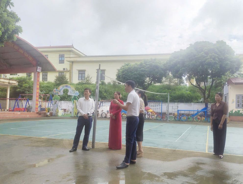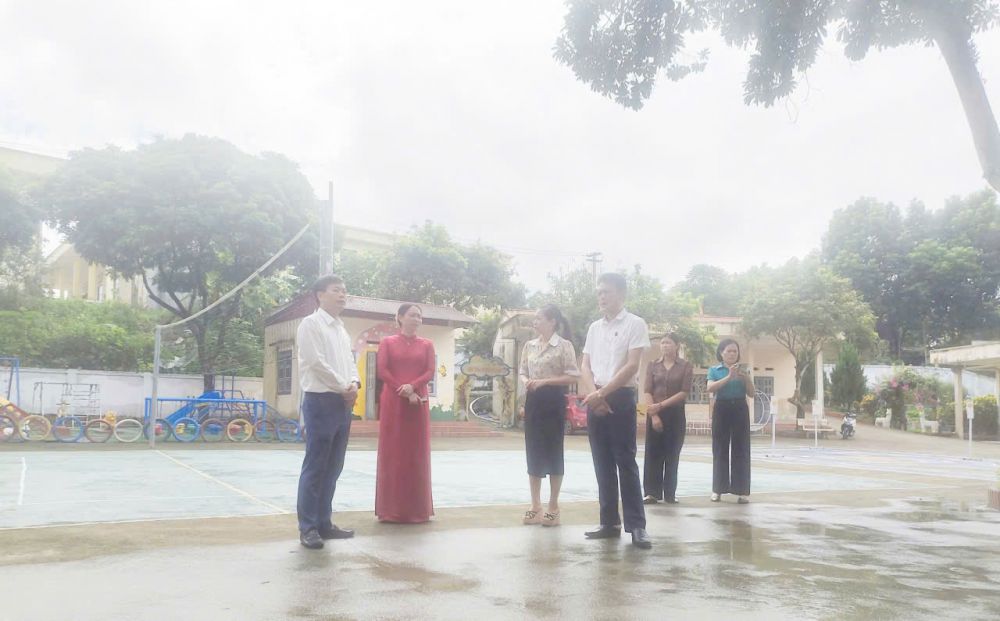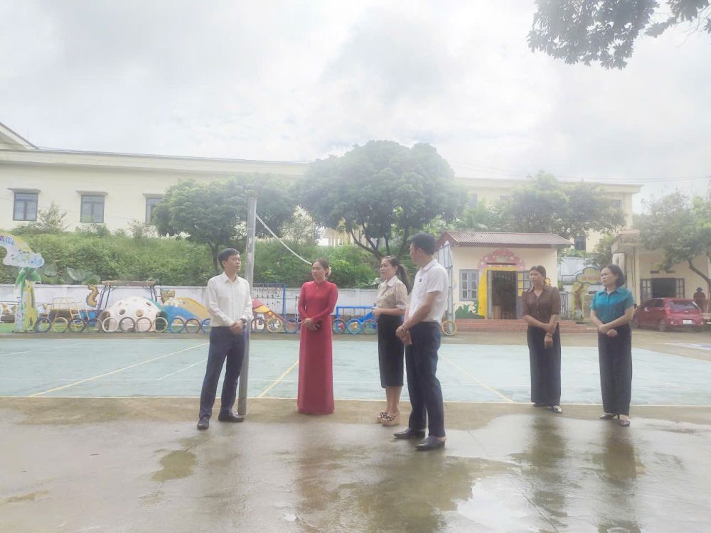 Tại buổi làm việc, đồng chí Nguyễn Lam Sơn cùng đoàn công tác đã trực tiếp kiểm tra cơ sở vật chất, khuôn viên trường lớp, phòng học, bếp ăn bán trú, công tác vệ sinh môi trường và công tác trang trí lớp học để đón chào năm học mới. Đoàn công tác đánh giá cao sự chủ động, tích cực của nhà trường trong việc chuẩn bị các điều kiện về cơ sở vật chất, đồ dùng, đồ chơi cũng như công tác vệ sinh an toàn thực phẩm, đảm bảo môi trường học tập xanh – sạch – đẹp, an toàn, thân thiện cho trẻ.