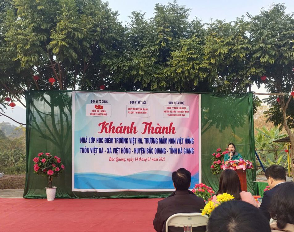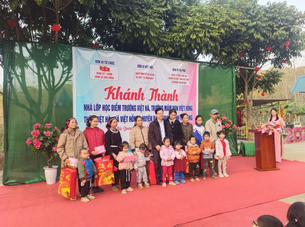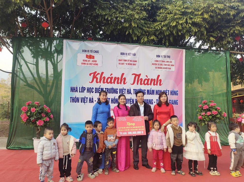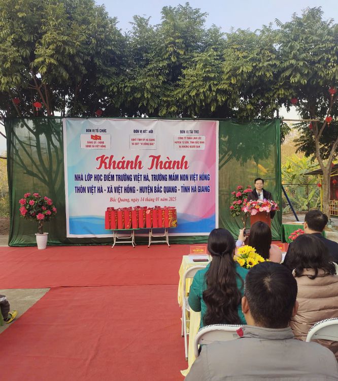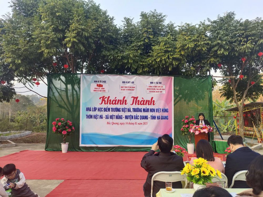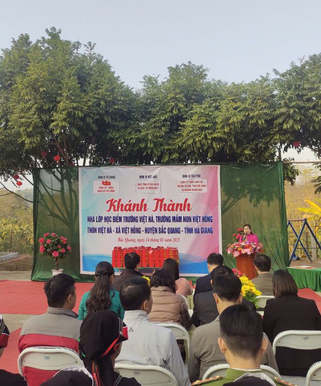 Thực hiện Công văn số 3681/UBND-VP, ngày 27/8/2024 của UBND huyện Bắc Quang về việc cho chủ trương xây dựng điểm trường Việt Hà, Trường Mầm non Việt Hồng, huyện Bắc Quang từ nguồn vận động tài trợ của công ty TNHH Linh Lộc. Chiều ngày 14/01/2025, được sự nhất trí của Thường trực Huyện ủy, UBND huyện, Đảng ủy - HĐND - UBND xã Việt Hồng long trọng tổ chức chương trình khánh thành công trình nhà lớp học điểm trường Việt Hà. Tới dự chương trình khánh thành có sự tham dự của Đ/c Trần Quang Minh - Uỷ viên Ban Thường vụ Tỉnh uỷ, Chủ nhiệm UBKT Tỉnh uỷ Hà Giang. Đ/c Ngô Văn Hiếu, Ủy viên Ban Thường vụ Huyện ủy, Phó Chủ tịch Thường trực UBND huyện. Đ/c Nguyễn Thùy Linh, Ủy viên Ban Thường vụ Huyện ủy, Chủ tịch Uỷ ban MTTQ Việt Nam huyện Bắc Quang. Đ/c Phạm Văn Trình, Uỷ viên Ban Thường vụ Huyện uỷ, Bí thư Đảng ủy Thị trấn Việt Quang, Trưởng đoàn công tác số 05 phụ trách xã. Đ/c Hoàng Thị Thu Hiền - Ủy viên Ban chấp hành Đảng bộ huyện - Trưởng phòng GD&ĐT huyện Bắc Quang. Ông: Nguyễn Văn Tuý Chủ nhiệm Hợp tác xã cơ khí tổng hợp Anh Tuý. Đ/c Nguyễn Thị Túy - Bí thư Đảng ủy, chủ tịch HĐND xã Việt Hồng cùng các đ/c trong Thường trực Đảng ủy, HĐND, UBND, UBMTTQ xã Việt Hồng; Các đ/c trong BQL thôn Việt Hà, các đ/c trong BGH, giáo viên, nhân viên, phụ huynh và các em học sinh.